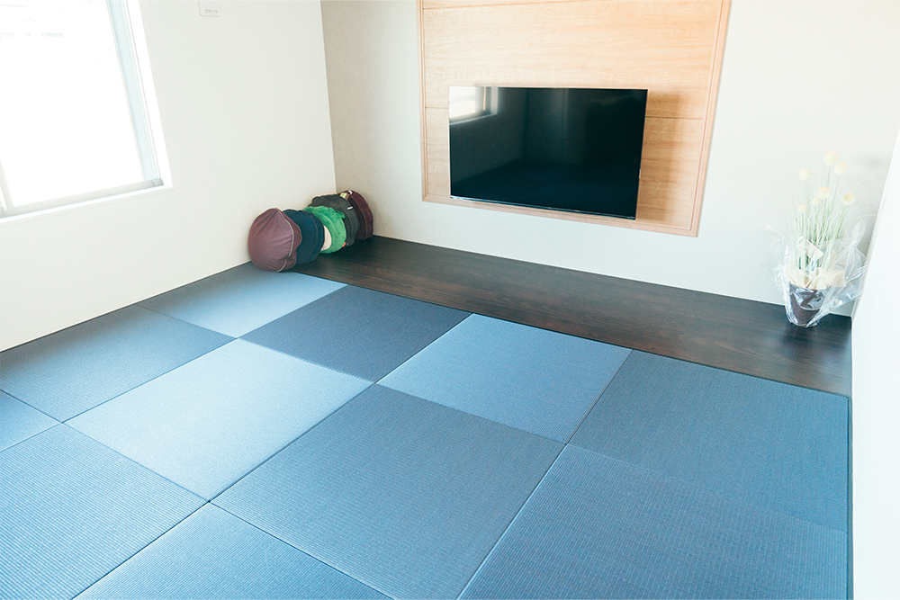 こちらが社員用休憩室の内部です。広々とした空間には、ゆったりとくつろげるようテレビやクッションを設置、リフレッシュの場として最適です。