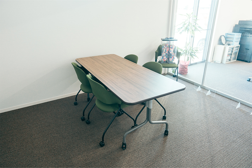 商談や打ち合わせの際に使用します。清潔感を大切にし、訪れるお客様にも快適に過ごしていただける空間づくりを心がけています。